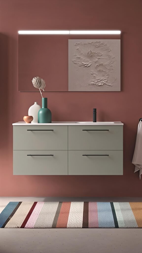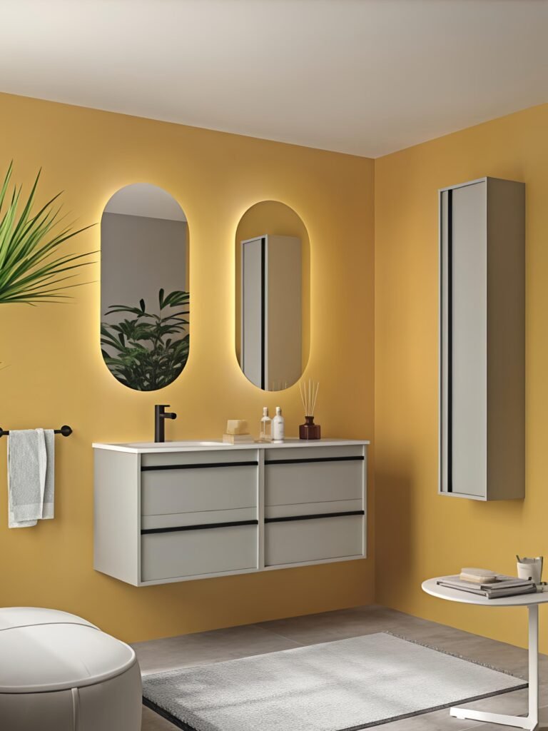 En este ambiente, el contraste con las paredes en tonos mostaza crea un baño lleno de personalidad y luz. Es la opción ideal para quienes buscan un diseño funcional sin renunciar a la estética vanguardista.