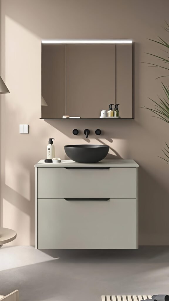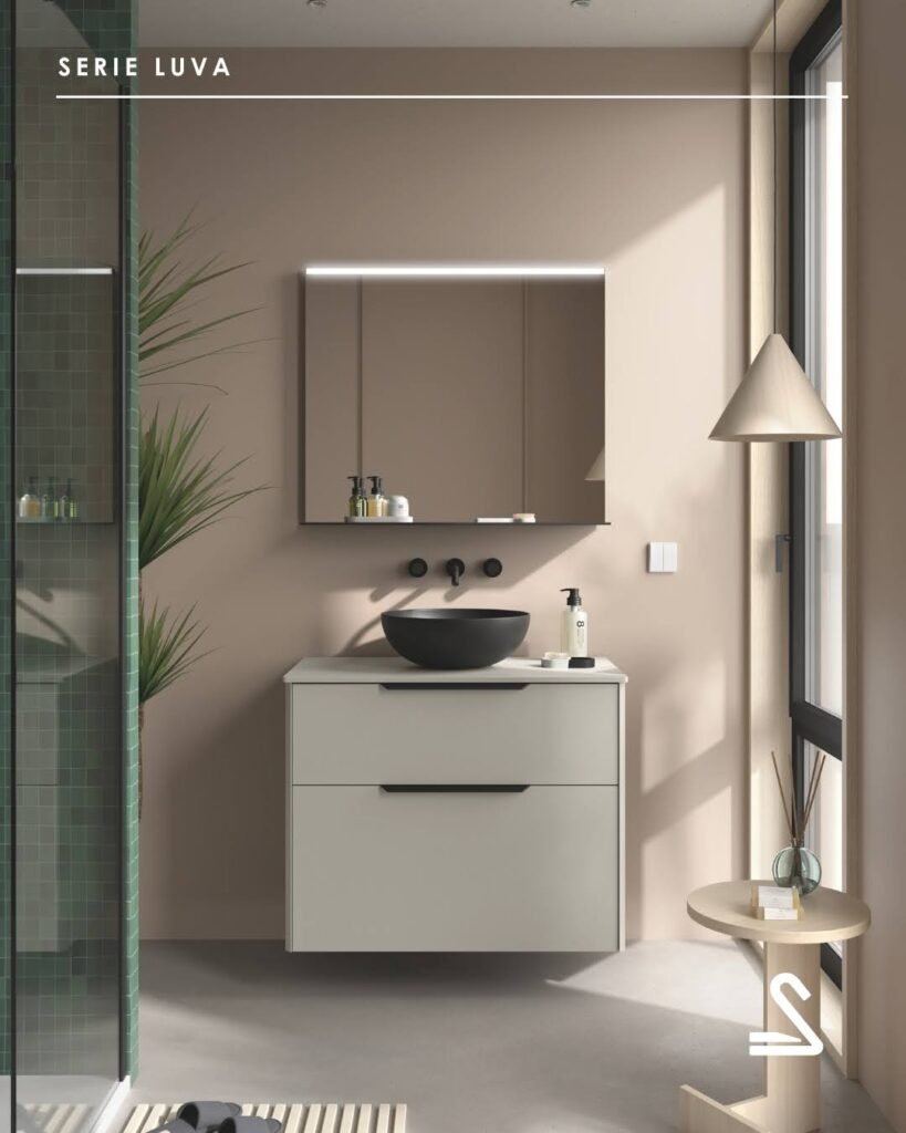 Para los amantes de los lavabos sobre encimera, la serie Luva en Grey Satin es la elección ganadora. El mueble sirve como base perfecta para resaltar lavabos de tipo bol en colores oscuros.