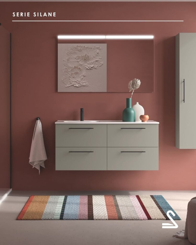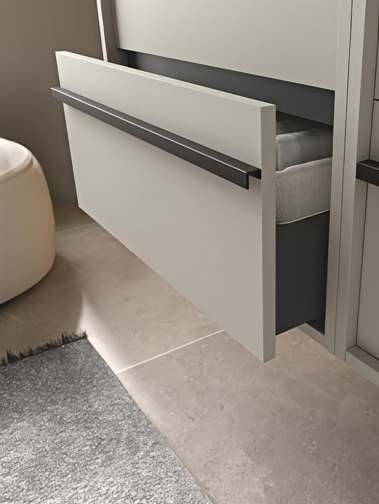 En la serie Silane, el Grey Satin potencia las líneas limpias y los frentes lisos. Al ser un mueble suspendido de cuatro cajones, ofrece una gran capacidad de almacenaje manteniendo una estética ligera.