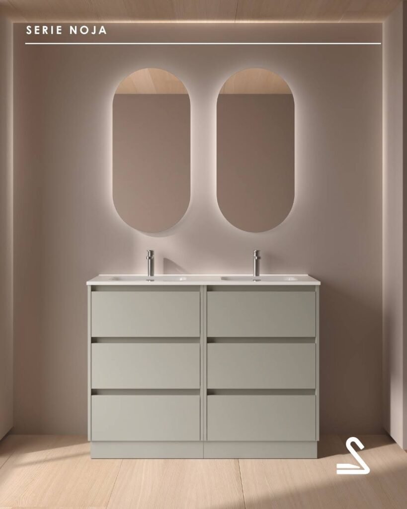 La serie Noja es sinónimo de versatilidad. Presentada aquí en una configuración de doble seno con el nuevo acabado gris satinado, es perfecta para baños compartidos.